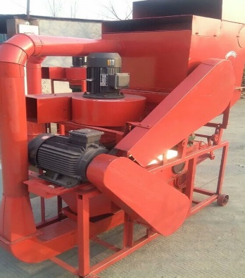 3、花生粒及破碎的花生殼在轉(zhuǎn)子的旋轉(zhuǎn)風(fēng)壓及打擊下,通過(guò)一定孔徑的篩網(wǎng)(花生第一次脫粒用大孔篩網(wǎng),清選后的小皮果更換成小孔篩網(wǎng)進(jìn)行第二次脫殼),這時(shí),花生殼、粒受到旋轉(zhuǎn)風(fēng)扇的吹力作用,重量輕的花生殼被吹出機(jī)體外。